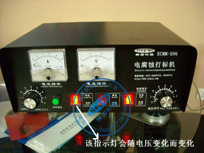 “電壓調(diào)節(jié)”鈕為輸出電壓調(diào)節(jié),選擇范圍在0-20V之間,并由中間的“電壓指示”表指示實(shí)際值,其選擇應(yīng)與標(biāo)注材料,溫度,時(shí)間配合選取,過高易產(chǎn)生過多的熱量,損壞打標(biāo)板,過低則標(biāo)注效果差,速度慢,建議使用時(shí)針對自己的情況,通過實(shí)驗(yàn)確定條件,如一般不銹鋼制品的標(biāo)注,推薦選8-10V左右。