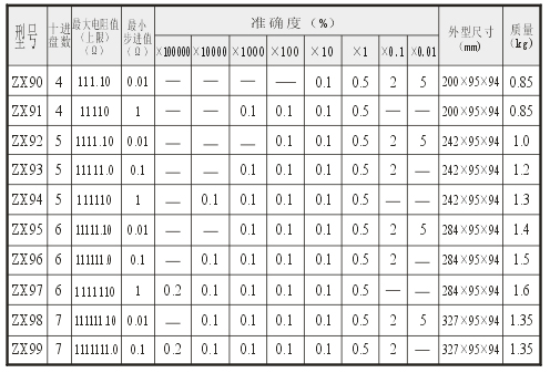 用 途 ZX90-ZX99系列直流電阻箱阻值調(diào)節(jié)范圍:10mΩ-1.111111MΩ 準(zhǔn)確度:0.1% 為串