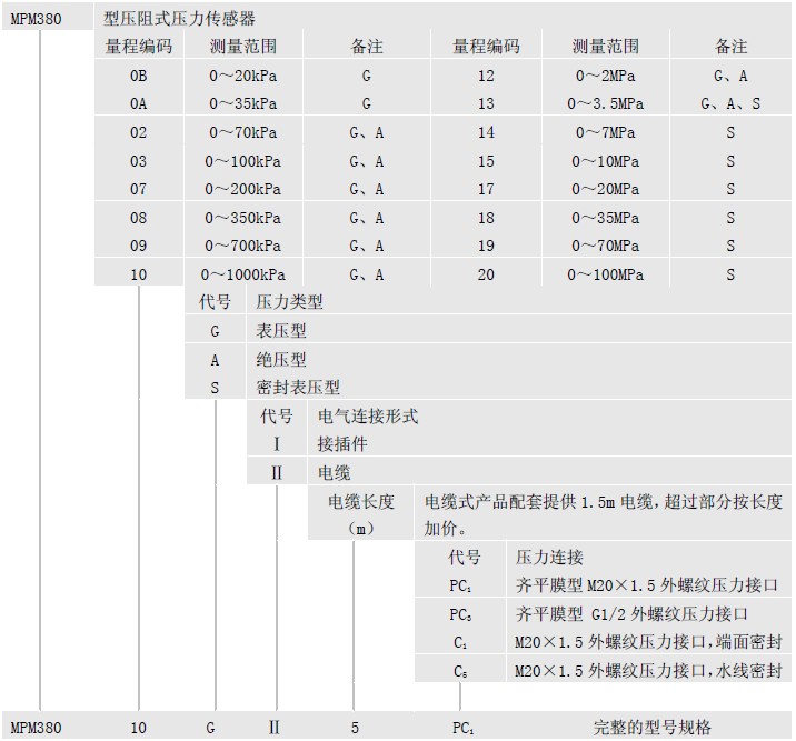 齊平膜片MPM380型壓阻式壓力傳感器壓力接口為G1/2和M20x1.5外螺紋,氟橡膠密封墊端面密封,適用于食品、醫(yī)藥、衛(wèi)生等行業(yè)或測量介質(zhì)有可能結(jié)垢的場合,測量范圍0~70kPa…35MPa。