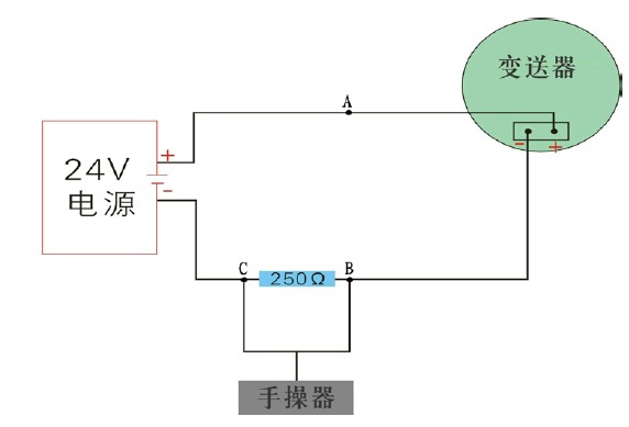 對兩線制變送器來說,一般的連接電路如圖所示:手持式通訊器既可接于現(xiàn)場兩端(A、B)上,也可接于負(fù)載電阻兩端(B、C)上,(HART規(guī)范允許負(fù)載電阻為230Ω~1100Ω),但不能直接跨接在電源兩端(A、C)上。