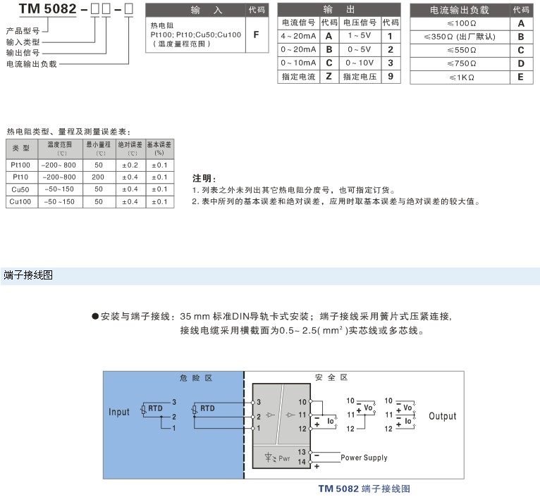 TM5082熱電阻輸入, 溫度變送隔離安全柵 一入一出特性 接收現(xiàn)場危險區(qū)域的熱電阻信號,經(jīng)過隔離和線性化處理,轉(zhuǎn)換為直流信號