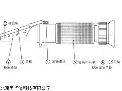 1.棱鏡座 2.檢測棱鏡 3.蓋板 4.調(diào)節(jié)螺絲 5.鏡筒和手柄 6.視度調(diào)節(jié)手輪 7.目鏡