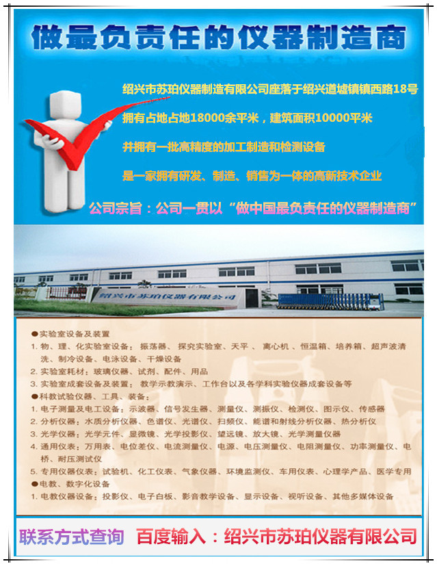 紹興蘇珀座落于紹興道墟鎮(zhèn)鎮(zhèn)西路18號,擁有占地占地18000余平米,建筑面積10000平米,并擁有一 批的加工制造和檢測設(shè)備,是一家擁有研發(fā)、制造、銷售為一體的高新技術(shù)企業(yè)。公司一貫以“做負(fù)責(zé)任的儀器 制造商"為銷售核心,從產(chǎn)品的研發(fā)到售后