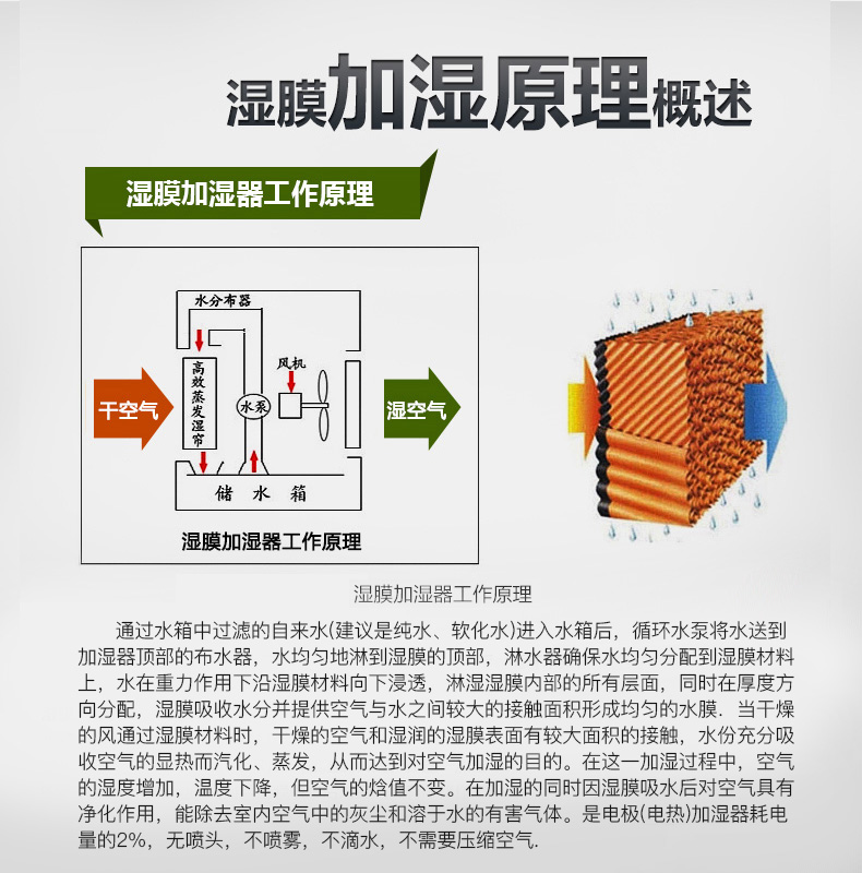 利用水的蒸發(fā)性,將水通過水泵和分配器不斷送到濕膜上部,在重力作用下水通過濕膜回到主水箱形成循環(huán),空氣通過濕膜時(shí)與濕膜充分接觸,過濾塵埃等顆粒物,使空氣凈化,濕度增加,從而達(dá)到加濕、凈化除塵的目的。
