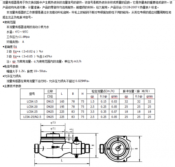 流量傳感器是用于熱交換回路中產(chǎn)生載熱液體的流量信號(hào)的部件,該信號(hào)是載熱液體體積或質(zhì)量的函數(shù)。它是熱量表的重要組成部件。該產(chǎn)品結(jié)構(gòu)可靠,計(jì)量準(zhǔn)確,產(chǎn)品的零部件均選用耐熱、耐磨損的材料,經(jīng)久耐用。產(chǎn)品符合CJ128-2007《熱量表》標(biāo)準(zhǔn)。