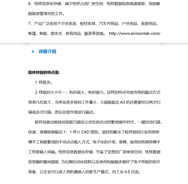 1、1:1快速掃描轉(zhuǎn)換出DXF和PLT格式文件,輕松對接CAD/CAM軟件或數(shù)控切割機、裁床等。2、紙樣信息化存儲,減少紙樣占用廠房空間,紙樣數(shù)據(jù)信息高速提取,徹底解脫版房管理員的工作。3、鞋樣放碼機 鞋樣數(shù)字化儀 玻璃外輪廓儀 玻璃外觀檢查機