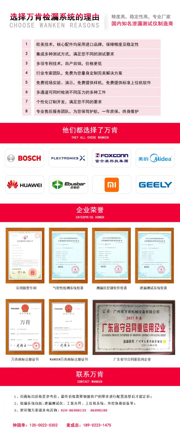 萬肯機械研發(fā)生產(chǎn)的氣密性測漏儀在國內(nèi)檢測行業(yè)里處于先進水平,部分領(lǐng)域逐漸代替進口儀器,為國內(nèi)的生產(chǎn)制造和質(zhì)量檢測降低采購成本,部分功能在國外技術(shù)的基礎上進行了消化吸收和改進,公司氣密性檢漏儀產(chǎn)品采用全中文的菜單,更符合國內(nèi)生產(chǎn)的使用要求;簡單易用的壓力調(diào)整裝置,更適應制造現(xiàn)場的可操作性;正負壓一體檢漏儀、雙壓力檢漏儀、12通道檢漏儀更是提高了企業(yè)的生產(chǎn)效率,同時降低企業(yè)對儀器數(shù)量的要求;更降低了工人的勞動強度,公司的氣密性檢漏儀產(chǎn)品廣泛應用于汽車零部件,燃氣具、醫(yī)療衛(wèi)生、機械閥門等行業(yè)。