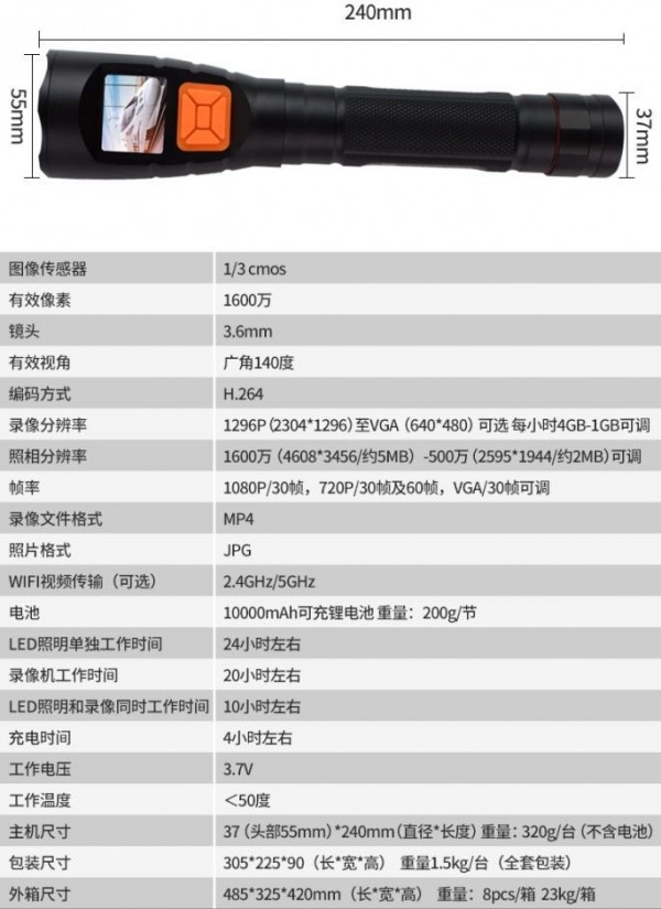 LED電筒和錄像同時(shí)工作時(shí)間:8小時(shí)左右
