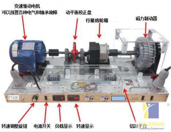 PT600由一臺(tái)1.5KW三相異步的電機(jī)、兩端由軸承支撐的轉(zhuǎn)子、一個(gè)行星齒輪箱和一個(gè)串聯(lián)的磁粉制動(dòng)器組成。有7臺(tái)故障電機(jī),每臺(tái)電機(jī)均配有電源插頭,便于接入配電箱中的電源線,以便用故障電機(jī)對(duì)電機(jī)進(jìn)行測(cè)試。軸承可以用有故障的軸承代替,可以進(jìn)行試驗(yàn)。通過對(duì)轉(zhuǎn)子施加質(zhì)量,可以分析電機(jī)電流波動(dòng)和不平衡引起的振動(dòng)兩者之間的關(guān)系。行星齒輪作為一種減速機(jī),具有較高的制動(dòng)效率,可通過植入故障齒輪,可以研究行星齒輪故障信號(hào)的分析。磁粉制動(dòng)器向電機(jī)施加負(fù)載,根據(jù)負(fù)載進(jìn)行信號(hào)分析,本系統(tǒng)還含有一套振動(dòng)數(shù)據(jù)采集器和電腦端分析軟件所構(gòu)成。包含可以檢測(cè)振動(dòng)的時(shí)域,頻域,振動(dòng)速度,振動(dòng)加速度,振動(dòng)位移以及各種分析圖表所構(gòu)成。