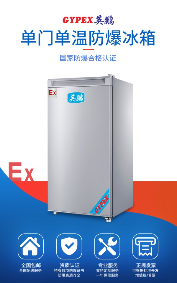 防爆冰箱90升結(jié)構(gòu)形式。 防爆單門電冰箱只有一扇門,沒有專門的冷凍室。其冷凍室箱體直接由蒸發(fā)器構(gòu)成,采用盒式結(jié)構(gòu),帶有小門,安裝在內(nèi)膽的上部,其內(nèi)溫度一般為-12~-6℃,可供制冰,冷凍化學(xué)品。蒸發(fā)器下面是冷藏室,中間無隔熱設(shè)施。冷藏室靠空氣的自然對流得以降溫,溫度一般控制在0~10℃,內(nèi)有感溫探頭,擱架,