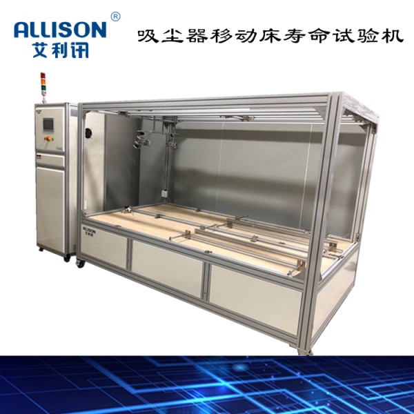 主要適用于對吸塵器壽命老化測試,試驗(yàn)時(shí)模擬吸塵器實(shí)際地面行走情況,在測試臺面鋪設(shè)地毯,使吸塵器在測試臺上相對做往復(fù)行走動作。通過傳動機(jī)構(gòu)以設(shè)定好的速度在不同的工作平面作往復(fù)直線運(yùn)動。PLC控制 7寸觸摸屏顯示相關(guān)檢測參數(shù)。相關(guān)檢測數(shù)據(jù)通過USB導(dǎo)出。通用性強(qiáng),操作簡單,控制方便,故障率低。