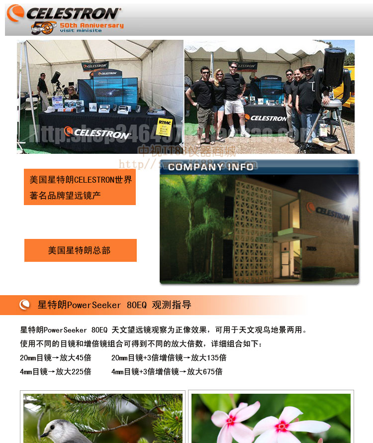 Celestron 是一個(gè)掌握了前沿科技技術(shù),并擁有多年的研究成果和多年制造經(jīng)驗(yàn)的公司。 隨著公司銷售渠道和產(chǎn)品供應(yīng)的不斷擴(kuò)大, 和計(jì)算機(jī)化的赤道式望遠(yuǎn)鏡CGE 系列的強(qiáng)力進(jìn)入市場(chǎng)。以這些競(jìng)爭(zhēng), Celestron公司現(xiàn)在能集中它的資源為用戶提供一個(gè)的滿意的平臺(tái)和一系列優(yōu)質(zhì)的產(chǎn)品。