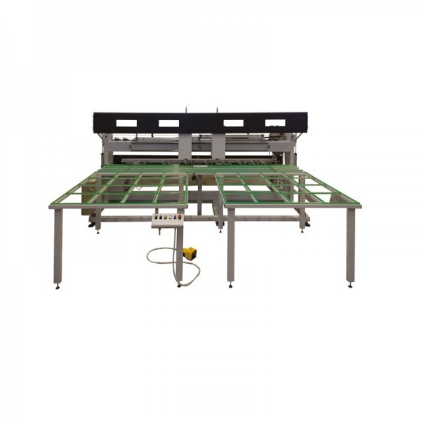 FOM INDUSTRIE用于測(cè)試和玻璃框架的垂直工作臺(tái),寬度可達(dá)2400毫米?;瑒?dòng)梁被一個(gè)架子擋住,以檢查拐角的確切90°。允許側(cè)出窗,便于將玻璃夾條插入下側(cè)。