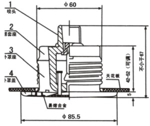 特點該產(chǎn)品由玻璃球噴頭、罩、外殼、底蓋組成。噴頭和罩一起安裝在管路管件上,再安裝外殼。外殼和底蓋由易熔合金焊接成一體,當發(fā)生火災時,環(huán)境溫度升高,達到易熔合金的熔點時,底蓋自動脫落,隨著溫度繼續(xù)升高,罩內(nèi)噴頭玻璃球因溫度敏感液體膨脹而破碎噴水。