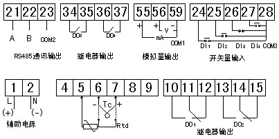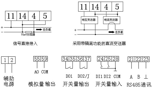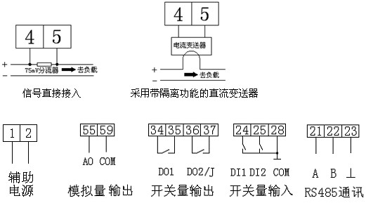 儀表可具有RS-485 通訊接口,采用Modbus-RTU 協(xié)議;可帶模擬量輸出、繼電器報(bào)警輸出、開關(guān)量輸入/輸出。根據(jù)不同要求,通過儀表面板按鍵,對變比、報(bào)警、通訊、開關(guān)量輸出進(jìn)行設(shè)置與控制。