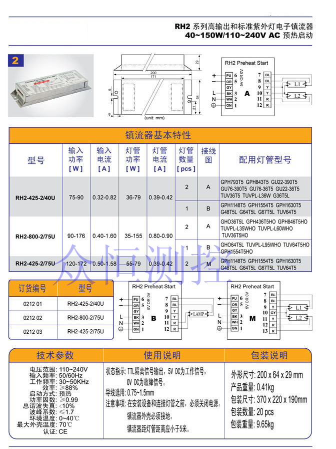 RH2系列紫外線電子鎮(zhèn)流器(40-150W)產(chǎn)品介紹: RH2系列高輸出和標(biāo)準(zhǔn)紫外燈電子鎮(zhèn)流器40-150W、200-400W、400-800W/110-220V AC預(yù)熱啟