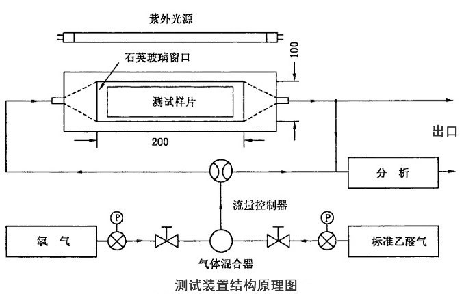 氣體光催化裝置是一全密閉的反應(yīng)器,其內(nèi)部裝有200mm*100mm大小,外部可調(diào)節(jié)高度的支撐塊,測試樣片放置在支撐塊上。支撐塊上方有一與其平行的光路窗口,反應(yīng)器外部的紫外光通過此窗口照射到樣片表面。通過調(diào)節(jié)支撐塊的高度使得樣片表面與窗口之間的距離大于5.0mm。反應(yīng)器只能在樣片表面和窗口之間通過。光路窗口材料可選用石英玻璃或硼玻璃。