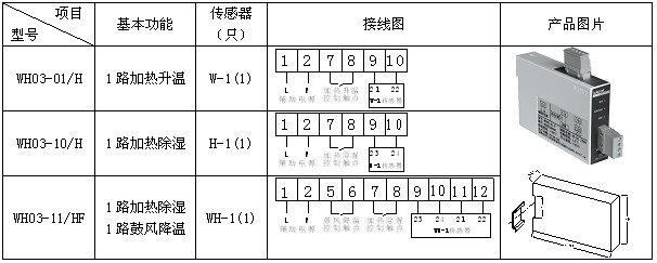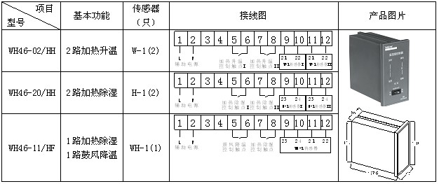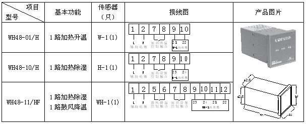 傳感器檢測箱內(nèi)溫濕度信息,并傳遞到控制器由控制器分析處理:當(dāng)箱內(nèi)的溫度、濕度達(dá)到或超過預(yù)先設(shè)定的值時(shí),控制器中的繼電器觸點(diǎn)閉合,加熱器(或風(fēng)扇)接通電源開始工作,對箱內(nèi)進(jìn)行加熱或鼓風(fēng)等;一段時(shí)間后,箱內(nèi)溫度或濕度遠(yuǎn)離設(shè)定值,控制器中的繼電器觸點(diǎn)斷開,加熱或鼓風(fēng)停止。除基本功能外不同型號還帶有斷線報(bào)警輸出、變送輸出、通信、強(qiáng)制加熱鼓風(fēng)等輔助功能。 3 產(chǎn)品介紹 3.1 WH系列普通型溫濕度控制器