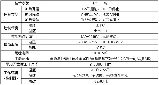 說明:“組合外接”即同時(shí)有溫度、濕度控制時(shí),傳感器置于同一外殼,由同一點(diǎn)采集溫度、濕度信息。 3.1.2 技術(shù)指標(biāo)