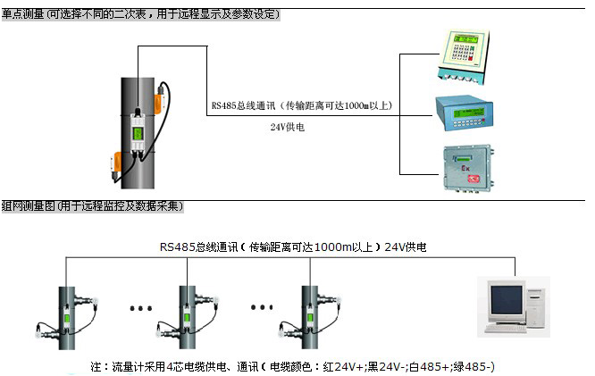 一次表與二次表(或計(jì)算機(jī))之間采用RS-485總線通訊,采用普通電纜即可,傳輸距離可達(dá)1000米以上,組網(wǎng)十分方便、快捷。這種傳輸方式抗干擾能力強(qiáng),解決了分體式超聲波流量計(jì)專用電纜成本高、抗干擾能力差、傳輸距離短等問題。