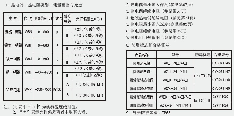 隔爆熱電阻、隔爆熱電偶主要技術(shù)參數(shù)