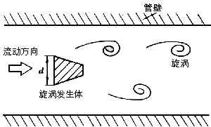 在流體中設(shè)置旋渦發(fā)生體(阻流體),從旋渦發(fā)生體兩側(cè)交替地產(chǎn)生有規(guī)則的旋渦,這種旋渦稱為卡曼渦街,如圖1所示。旋渦列在旋渦發(fā)生體下游非對稱地排列。設(shè)旋渦的發(fā)生頻率為f,被測介質(zhì)來流的平均速度為U,旋渦發(fā)生體迎面寬度為d,表體通徑為D,根據(jù)卡曼渦街原理,有如下關(guān)系式