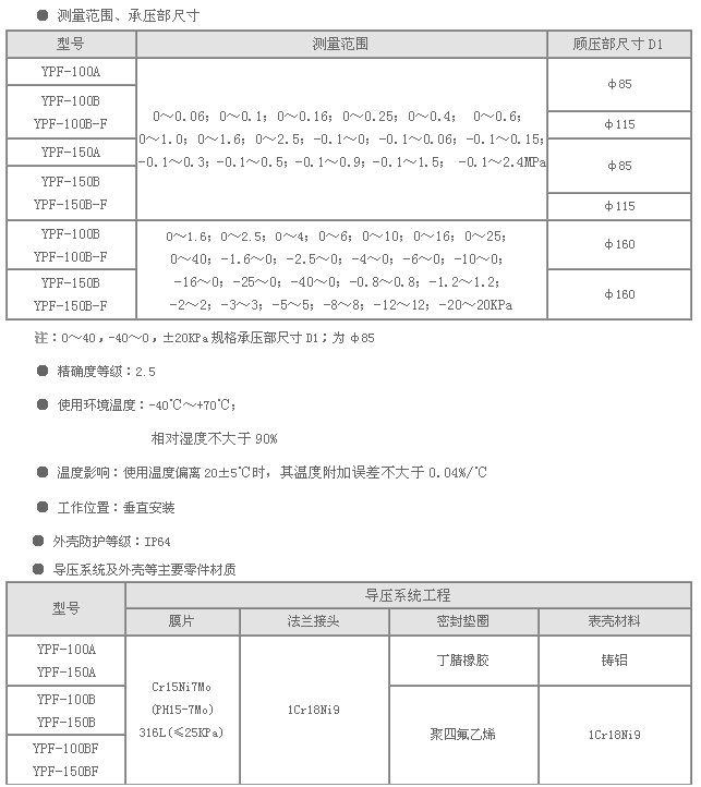 用途說(shuō)明 膜片壓力表適用于測(cè)量有一定腐蝕性、粘稠介質(zhì)和非結(jié)晶及非凝固的各種流體介質(zhì)的壓力或負(fù)壓。 可根據(jù)測(cè)量介質(zhì)對(duì)腐蝕性能