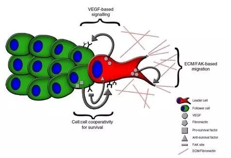 這倆貨之所以敢這么明目張膽的秀恩愛,完全仰仗著血管內(nèi)皮生長(zhǎng)因子(VEGF)和Notch蛋白。帶頭細(xì)胞高表達(dá)并分泌的VEGFA散發(fā)著讓跟風(fēng)小弟著魔的魅力,而跟風(fēng)癌細(xì)胞也會(huì)分泌Notch蛋白,給大哥添加Buff,以維持其生長(zhǎng)狀態(tài)。