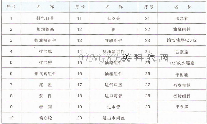 本型泵設(shè)有六組園盤(pán)型排氣閥(6)(見(jiàn)結(jié)構(gòu)圖),排氣閥主要由彈簧和閥片等零件組成,當(dāng)泵腔內(nèi)的氣體和油從排氣閥排出時(shí),經(jīng)過(guò)油箱(16)內(nèi)的擋油帽(3)進(jìn)行油氣分離,氣體排至大氣,油經(jīng)過(guò)濾油器(15)過(guò)濾,再由油泵(22)汲入,強(qiáng)壓輸送至小油箱(15),然后才供給軸承、滑閥、泵腔等活動(dòng)部分,隨著泵的運(yùn)轉(zhuǎn),被壓縮的氣體和油又由排氣閥排出,因此本型泵的潤(rùn)滑均是自動(dòng)進(jìn)行的。泵油除了起潤(rùn)滑密封作用處,還有一個(gè)是重要的作用,就是當(dāng)泵抽吸的氣體量較少時(shí),排氣閥也能進(jìn)行工作,被壓縮的少量氣體和油一起頂開(kāi)排氣閥,達(dá)到排氣之目的。