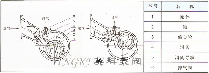 當(dāng)滑閥轉(zhuǎn)向腔的上死點(diǎn)時(shí),原來(lái)的B室小時(shí)了,A室代替了B室,在原來(lái)的A室位置上形成了新的A室。在B室被壓縮的后階段,被壓縮的氣體頂開(kāi)排氣閥6排出泵外,如此循環(huán)不息就形成了泵的工作。