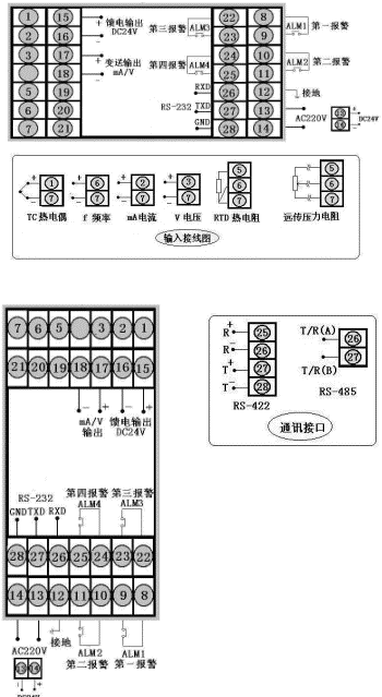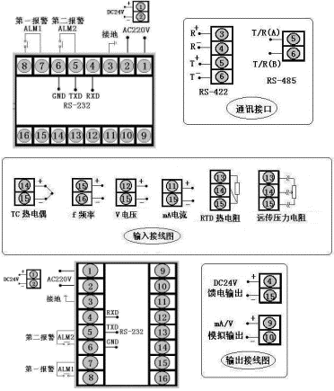 測量顯示,通訊方式為RS232,輸出方式為繼電器輸出,輸入類型為PT100,一報警為上限報警,第二報警為下限報警,AC90~260V供電。