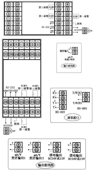 通訊方式為RS-232,輸出方式為繼電器輸出,輸入類型為Pt100.1,一報(bào)警為上限報(bào)警,第二報(bào)警為下限報(bào)警,DC24V饋電輸出,DC24V供電,豎表。