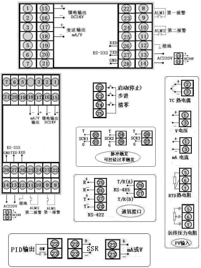 通訊方式為RS-232,輸出方式為繼電器輸出,輸入類型為Pt100.1,一報(bào)警為上限報(bào)警,第二報(bào)警為下限報(bào)警,DC24V饋電輸出,DC24V供電,豎表。