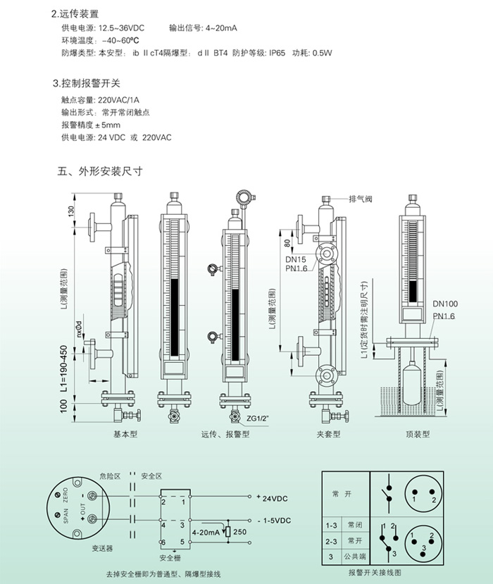 l 上下限開關(guān)輸出 利用磁性浮子隨液位移動,使安裝在液位計立管設(shè)定位置的簧片開關(guān)動作,實現(xiàn) ON-OFF 控制或報警。