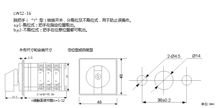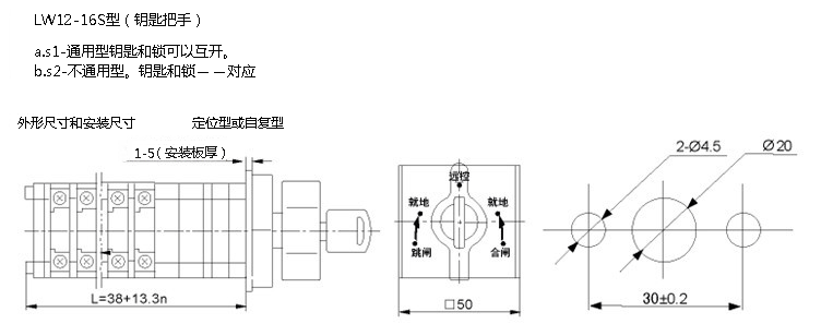 ![]() ![]() ![]() ![]() ![]() 注(1):派生代號一無代號為基本型,定位操作;“D”定位—自復(fù)操作;“Z”自復(fù)操作;“L”拉出旋轉(zhuǎn)操作;“S”帶鑰匙鎖操作;“Y”簡易鎖操作;“N”帶紅綠燈操作。