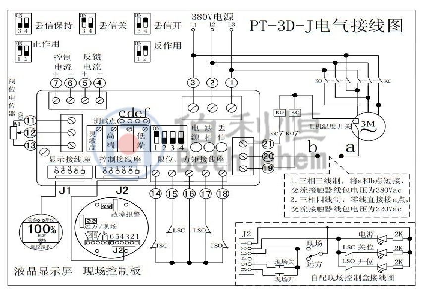 PT-3D-J型三相調(diào)節(jié)型模塊,是在我公司推出的PT-3C-J型模塊的基礎(chǔ)上研發(fā)的新一代三相整體調(diào)節(jié)型電動執(zhí)行器專用控制模塊。其接收來自DCS等系統(tǒng)或PLC等控制器的DC4~20mA標(biāo)準(zhǔn)電流信號,控制電動執(zhí)行器。完成對閥門開啟程度的比例調(diào)節(jié)。該產(chǎn)品集相序自動調(diào)整、比例調(diào)節(jié)、隔離放大、閥位變送、功率驅(qū)動等諸多功能于一體,具有缺相保護(hù)、過力矩保護(hù)、電子互鎖保護(hù)、禁動延時保護(hù)、丟信保護(hù)、溫度保護(hù)等完善的保護(hù)功能。還可加配現(xiàn)場按鈕板,實施現(xiàn)場操作并提供多種報警輸出;加配閥位液晶顯示屏,直觀地顯示閥位開度;加配紅外遙控器,實現(xiàn)較高防護(hù)等級的現(xiàn)場操作。該產(chǎn)品具有抗干擾能力強(qiáng)、性能可靠、抗震、防潮、體積小、接線簡單,調(diào)試方便等優(yōu)點?,F(xiàn)已廣泛應(yīng)用于DKJ、DKZ、DZW、LQA、QB、QT、SD、SM、SMC、SR、2SA、802、903、3410、3610等系列產(chǎn)品上。