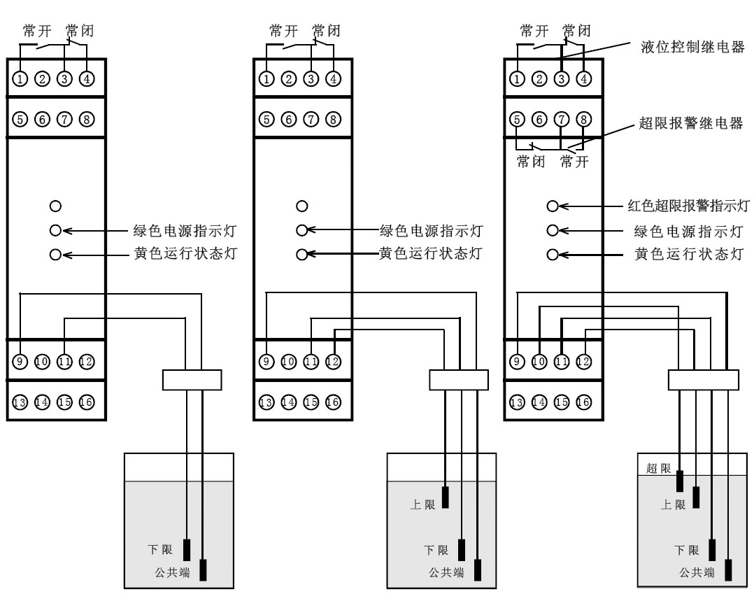 典型應(yīng)用 1 .三根電:三根電常用,適合給排水和其他進(jìn)液或排液控制,與機(jī)泵結(jié)合可以實(shí)現(xiàn)自動(dòng)控制給排水。 進(jìn)液控制: 液位低于下限時(shí),繼電器吸合,黃色燈亮,水泵電機(jī)啟動(dòng); 液位高于上限時(shí),繼電器斷開,黃色燈滅,水泵電機(jī)停止。 排液控制:液位高于上限時(shí),繼電器吸合,黃色燈亮,水泵電機(jī)啟動(dòng); 液位低于下限時(shí),繼電器斷開,黃色燈滅,水泵電機(jī)停止。 注意:進(jìn)液、排液的功能切換是由內(nèi)部撥動(dòng)開關(guān)實(shí)現(xiàn) 撥動(dòng)開關(guān)在1時(shí)為進(jìn)液控制 2.四根電:四根電則是在進(jìn)液或排液功能的基礎(chǔ)上增加了上限報(bào)警或下限報(bào)警功能,防止水位超高溢流或過低空泵運(yùn)行。 |