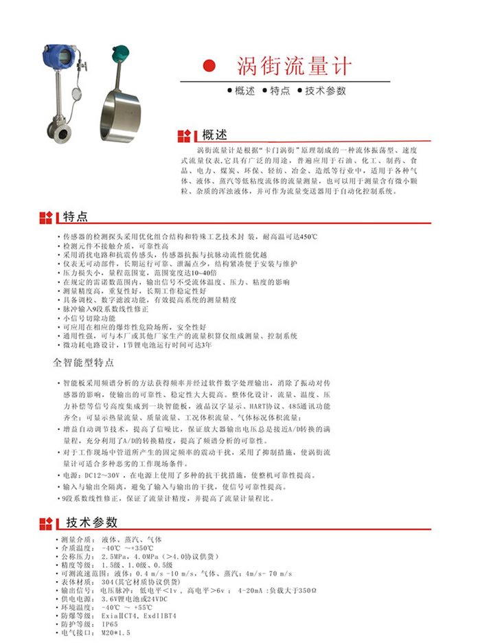 渦街流量計是根據(jù)卡門渦街原理制成的一種流體振蕩型、速度式儀表,它具有廣泛的用途,普遍應(yīng)用于石油、化工、制藥食品、電力、煤炭、環(huán)保、輕紡、冶金、造紙等行業(yè)中,適用于各種氣體、液體、蒸汽等低粘度流體的流量測量,也可用于測量含有微小顆粒、雜質(zhì)的渾濁液體,并可作為流量變送器用于自動化控制系統(tǒng)。