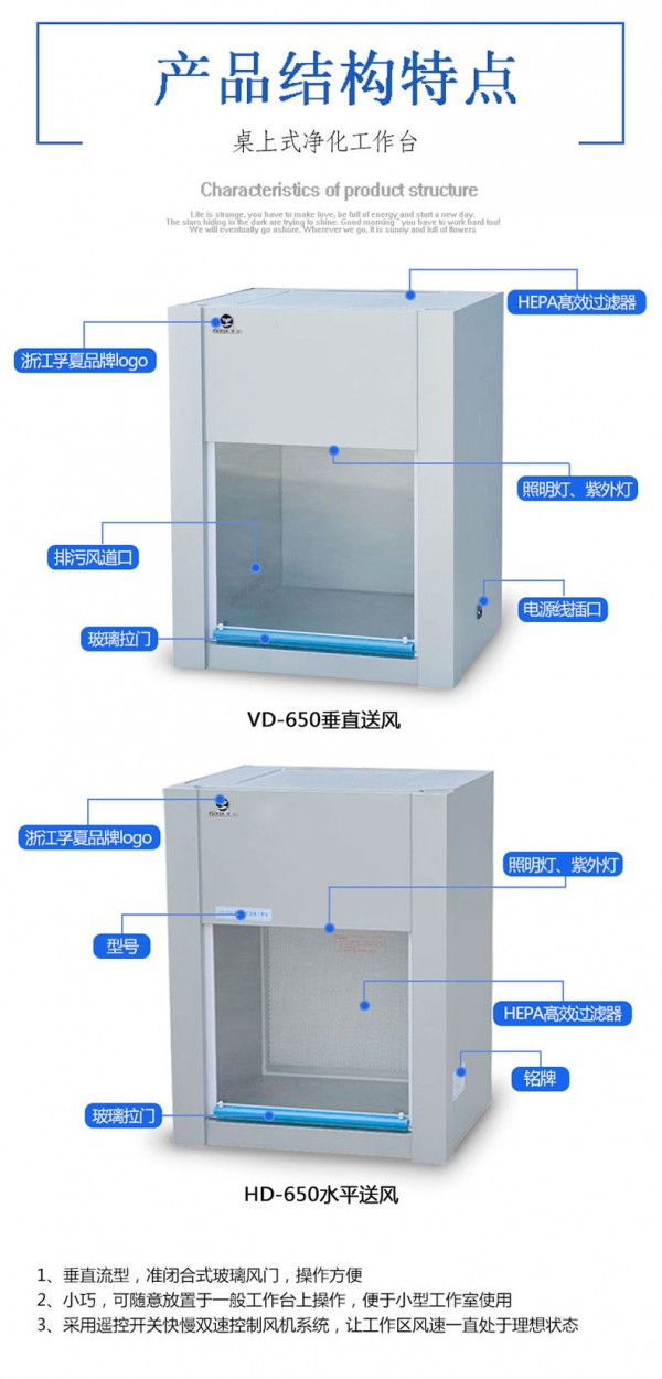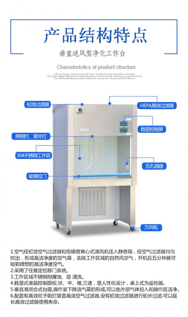 凈化工作臺(tái)由箱體、風(fēng)機(jī)、過濾器、操作開關(guān)等幾大部件組成。箱體采用彩鋼板等制作,表面噴塑處理,工作臺(tái)面采用不銹鋼制作。凈化單元采用了可調(diào)風(fēng)量的風(fēng)機(jī)系統(tǒng),通過調(diào)節(jié)風(fēng)機(jī)的工作狀態(tài),可使?jié)崈艄ぷ鲄^(qū)中的平均風(fēng)速保持額定范圍內(nèi),而且有效地延長(zhǎng)了過濾器使用壽命。