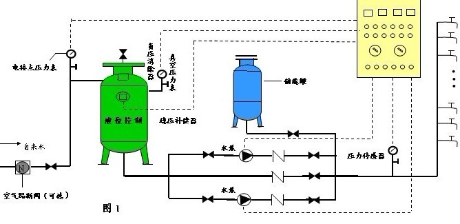 該設(shè)備采用微機(jī)控制變頻調(diào)速實(shí)現(xiàn)恒壓供水,其中的負(fù)壓補(bǔ)償系統(tǒng)克服了對(duì)管網(wǎng)的不良影響。流程圖如下: