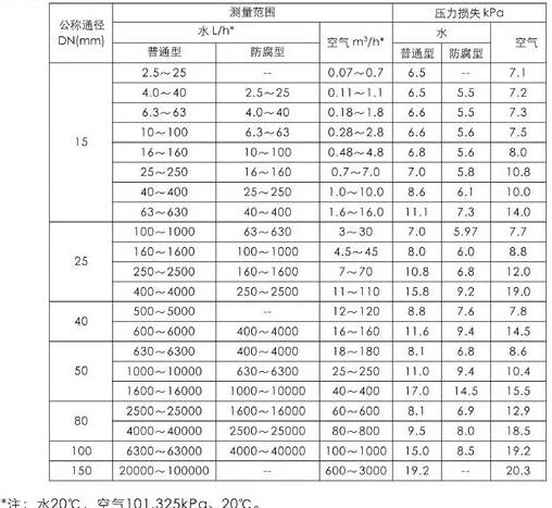 測量范圍:水(20℃)1-200000 l/h 空氣(20℃,0.1013MPa)0.03-4000m3/h 參見流量表,特殊流量可訂制