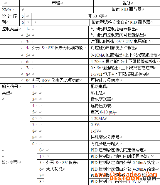 ※ 信號(hào)輸入 ◆ 只需做相應(yīng)的按鍵設(shè)置和硬件跳線設(shè)置,即可在以下所有輸入信號(hào)之間任意切換,即設(shè)即用。 ◆ 熱電阻:Pt100、Pt100.0、Cu50、Cu100、Pt10。 ◆ 熱電偶:K、E、S、B、T、R、N。 ◆ 標(biāo)準(zhǔn)信號(hào):0-10mA、4-20mA、0-5V、1-5V。 ◆ 霍爾傳感器:mV輸入信號(hào),0-5V以內(nèi)任意信號(hào)按鍵即設(shè)即用。 ◆ 遠(yuǎn)傳壓力表:30-350W,信號(hào)誤差現(xiàn)場(chǎng)按鍵修正。其它用戶特殊訂制輸入信號(hào)。 ※ 多種給定方式可選。 ◆本機(jī)給定方式(LSP)。 可通過(guò)面板上的增減鍵直接修改給定值,也可以加密碼鎖定不讓修改。 ◆時(shí)間程序給定(TSP)。 ◆ 外部模擬給定(遠(yuǎn)程給定)(RSP)。 10mA/4-20mA/0-5V/1-5V通用。 ※ 多種控制輸出方式可選擇(96×96、72×72方表和48×96小表多種控制輸出之間可模塊切換)。 ◆ 0-10mA、4-20mA、0-5V、1-5V控制輸出。 ◆ 時(shí)間比例控制繼電器輸出(1A/220VAC阻性負(fù)載)。 ◆ 時(shí)間比例控制5-30VSSR控制信號(hào)輸出。 ◆ 時(shí)間比例控制雙向可控硅輸出(3A,600V)。 ◆ 單相2路可控硅過(guò)零或移相觸發(fā)控制輸出(電路可觸發(fā)3-1000A可控硅)。 ◆ 三相6路可控硅過(guò)零或移相觸發(fā)控制輸出(電路可觸發(fā)3-1000A可控硅)。 ※ 外掛三相SCR觸發(fā)器。 ※ 自整定算法 獨(dú)特的PID參數(shù)自整定算法,將的控制理論和豐富的工程經(jīng)驗(yàn)相結(jié)合,使得本公司的PID調(diào)節(jié)器可適應(yīng)各種現(xiàn)場(chǎng),對(duì)一階慣性負(fù)載,二階慣性負(fù)載,三階慣性負(fù)載,一階慣性加純滯后負(fù)載,二階慣性加純滯后負(fù)載,三階慣性加純滯后負(fù)載,這六種有代表性的典型負(fù)載的全參數(shù)測(cè)試表明,PID參數(shù)自整定的成功率達(dá)95%以上。 ※ 可帶RS485 /RS232/Modem隔離通訊接口或串行標(biāo)準(zhǔn)打印接口。 ※ 單片機(jī)智能化設(shè)計(jì)。 ※ 零點(diǎn)、滿度自動(dòng)跟蹤,長(zhǎng)期運(yùn)行無(wú)漂移,全部參數(shù)按鍵可設(shè)定。 ※ FBBUS- ascii 碼協(xié)議與MODBUS-RTU協(xié)議可選(MODBUS-RTU協(xié)議僅用于Modbus選項(xiàng),接線方式與 RS485相同). ★ 技術(shù)指標(biāo) ※使用條件: 環(huán)境溫度:0 ~ 50℃; 相對(duì)濕度:≤90% ※電源電壓: AC90V ~ 265V (50 ~ 60HZ)或DC24±10%V ※基本誤差: 0.5%F.S±1字 ※顯示分辨率: 0.001,0.01,0.1,1 ※輸入特性: 電偶型:輸入阻抗大于10MW電阻型:引線電阻要求0~5W, 三線相等電壓型:輸入阻抗 大于300kW 電流型:輸入阻抗250W ※輸出特性: 繼電器容量:3A/220VAC或3A/24VDC,阻性負(fù)載48×96小表及96×96方表 0./240VAC電流型變送器輸出負(fù)載阻抗:小于600W電壓型變送輸出負(fù)載:大于200KW ※內(nèi)部冷端補(bǔ)償溫度范圍: 0 ~ 50℃ ※變送器電源輸出: 電壓24±10%VDC,zui大電流22mA,可直接配接二線制無(wú)源變送器 ※功耗: < 3W ※重量: < 0.5kg |
