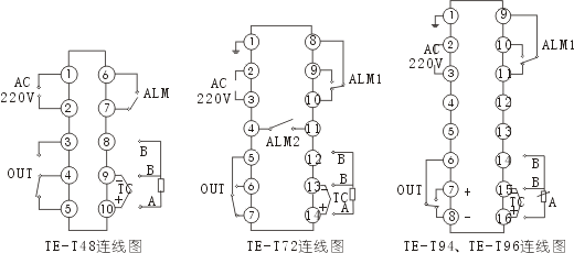 | 注:所有接線圖中OUT所指單元為主控輸出單元,其中開關(guān)狀態(tài)是指帶繼電器輸出狀態(tài),+、-狀態(tài)是指連續(xù)電流,電壓輸出端子及接固態(tài)繼電器時(shí)的脈沖直流電壓輸出端子,接可控硅輸出時(shí),-端子接控硅觸發(fā),+端接控硅條一陽(或單相硅的陰),主控輸出接線圖例見下: |