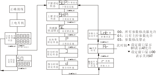 注意:①在第二設(shè)定狀態(tài),當(dāng)AT=0時(shí),按SET鍵時(shí)間超過5秒鐘將退出設(shè)定狀態(tài),進(jìn)入正??刂茽顟B(tài)。