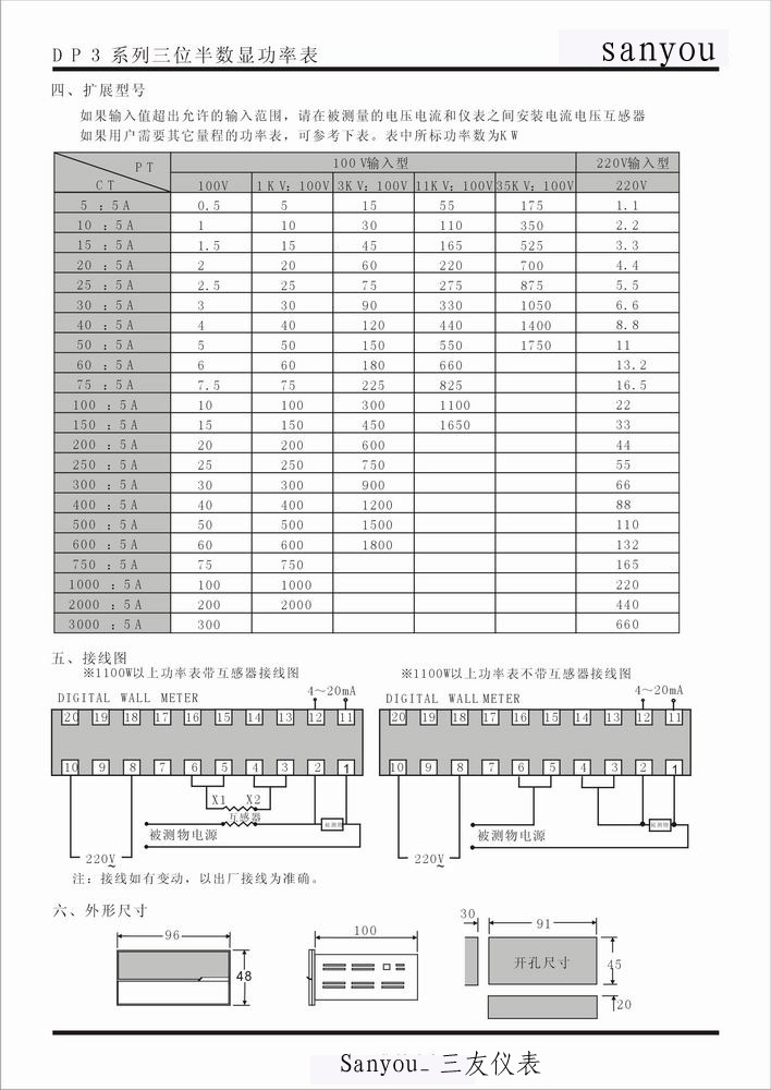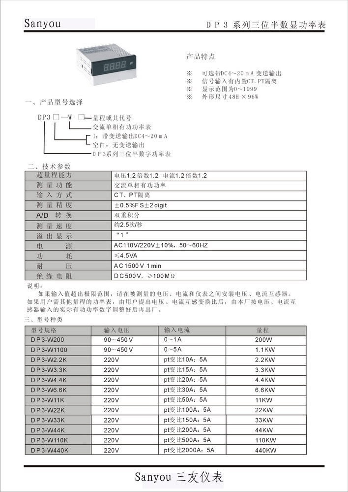 DP3-W1100功率表,全四位顯示,0.2級,外型尺寸48*96MM,可選帶繼電器和變送輸出,電源供電90-260V