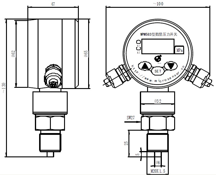MPM583型數(shù)顯壓力開關(guān)是集壓力測(cè)量、顯示、控制于一體的智能數(shù)顯壓力控制產(chǎn)品。該產(chǎn)品為全電子結(jié)構(gòu),前端采用帶隔離膜片的壓阻式壓力傳感器,輸出信號(hào)由,低溫漂的放大器放大,送入的A/D轉(zhuǎn)換器,轉(zhuǎn)換成微處理器可以處理的數(shù)字信號(hào),經(jīng)過運(yùn)算處理的信號(hào)控制兩路繼電器,對(duì)控制系統(tǒng)壓力進(jìn)行測(cè)控。該產(chǎn)品使用靈活,操作簡(jiǎn)單,調(diào)試容易,安全可靠,廣泛應(yīng)用于水電,自來水,石油,化工,機(jī)械,液壓等行業(yè),對(duì)流體介質(zhì)的壓力進(jìn)行測(cè)量、顯示和控制。