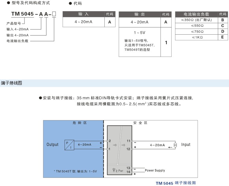 TM50454~20mA電流輸入, 直流信號(hào)輸出隔離安全柵 一入一出特性 4~20mA輸入;4~20mA輸出。 的直流電源供電方式。概述