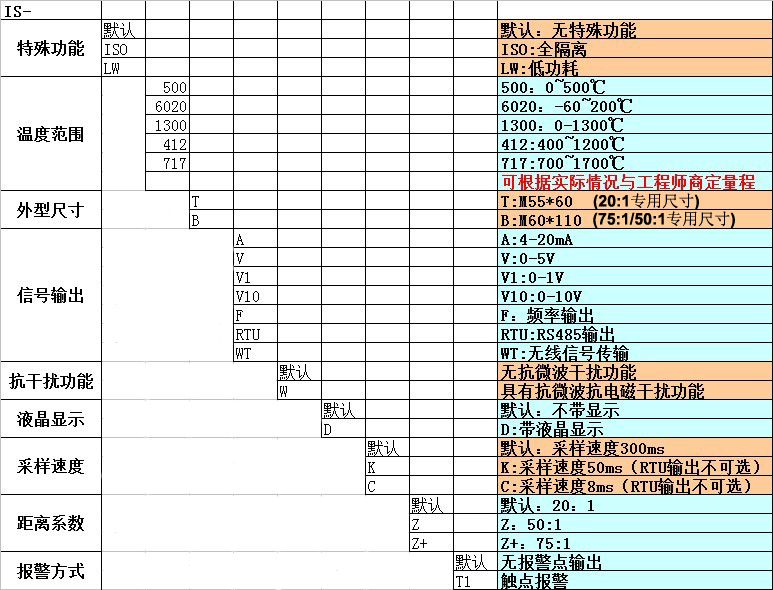 無特殊功能;0-500的溫度范圍;外型尺寸:M55*60;RS485信號(hào)輸出;無抗微波功能;不帶液晶顯示;采樣速度8毫秒;距離系數(shù)比:50:1;9-24VDC寬電壓供電;無報(bào)警點(diǎn)輸出。(默認(rèn)均不需要寫出代替字母)