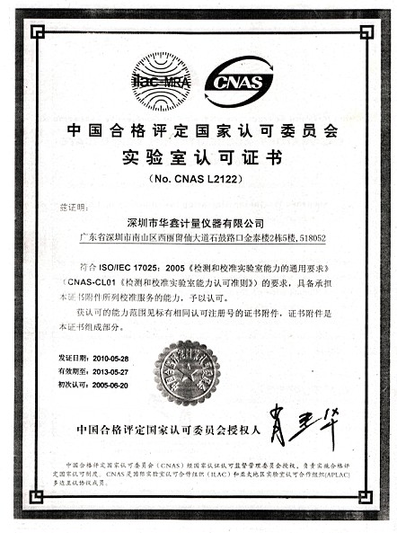 華鑫計(jì)量校準(zhǔn)實(shí)驗(yàn)室已獲得中國(guó)合格評(píng)定國(guó)家認(rèn)可委員會(huì)(CNAS)的認(rèn)可,認(rèn)可證書編號(hào)為:NO.CNAS L2122(認(rèn)可范圍見附表),其校準(zhǔn)、檢測(cè)數(shù)據(jù)可追溯到國(guó)家及國(guó)際標(biāo)準(zhǔn),所出具的證書、報(bào)告獲得國(guó)際實(shí)驗(yàn)室認(rèn)可合作組織多邊互認(rèn)協(xié)議(ILAC-MRA)其他成員的承認(rèn)和認(rèn)可,完全滿足ISO/IEC17025和ISO9000體系的要求。