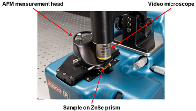 如上圖所示,試樣固定在硒化鋅棱鏡上。用戶可以通過視頻顯微鏡快速發(fā)現(xiàn)其感興趣的特征點。AFM探針針尖能夠?qū)υ嚇有蚊策M行高分辨率表征,并檢測試樣的局部紅外吸收。
